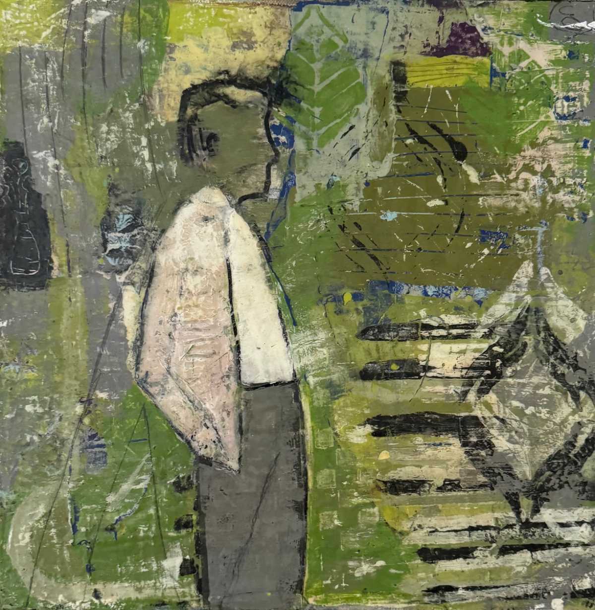 This 12″ x 12″ mixed media painting is on gallery wrapped canvas and sealed with thick modeling gel then cold wax.