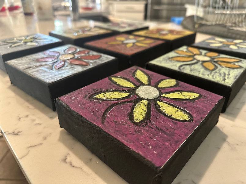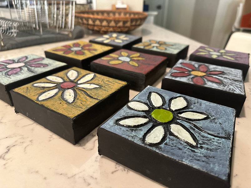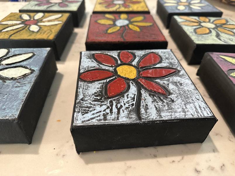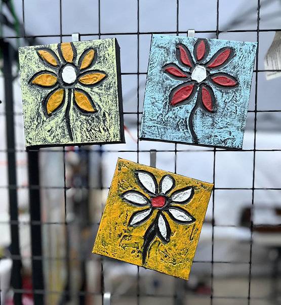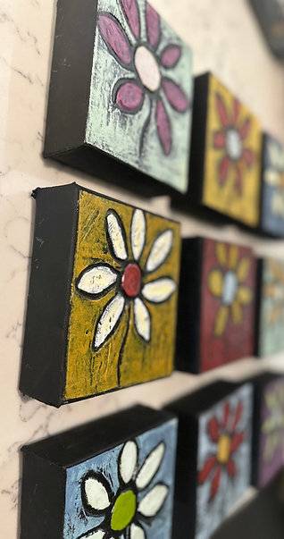 These 5″ x 5″ mixed media paintings on canvas are fun. Sold as singles ($40), as triptychs or more. Contact us with special requests.